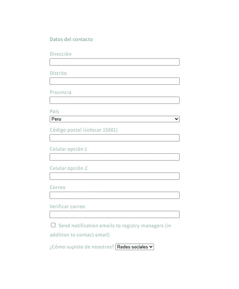 La opción de *Send notification emails to registry managers (in addition to contact email) Puedes marcar esta opción para que otra persona (además de ti) reciba notificaciones sobre la lista y pueda administrar.