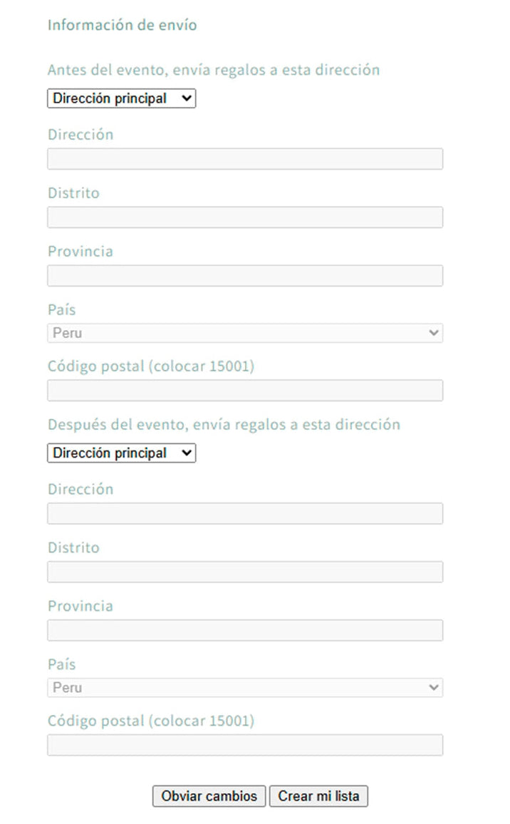 Si prefieres recibir los regalos luego del evento, completa también esta sección con la dirección correspondiente.