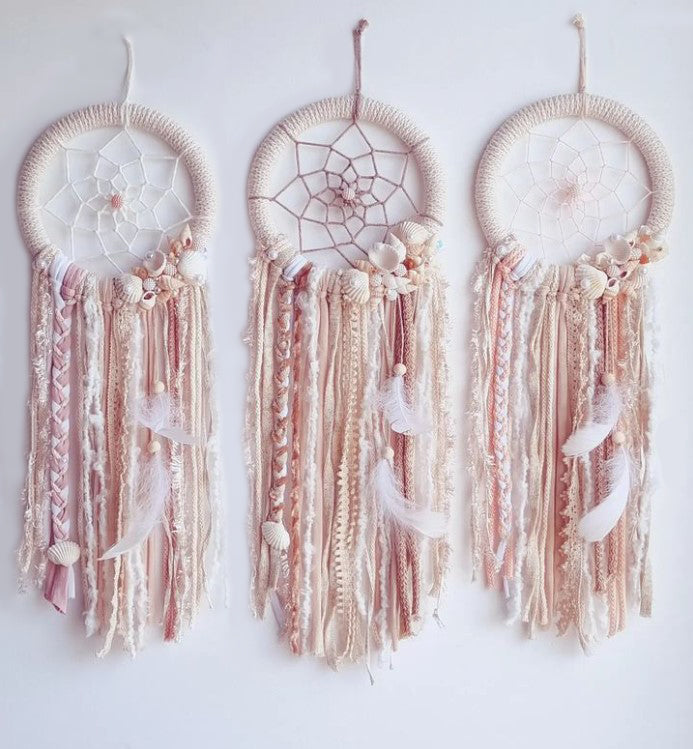 Piezas colgantes de pared hecho a mano con cintas, hilos, cuerdas, fibras y trapillos de diferentes colores y texturas.