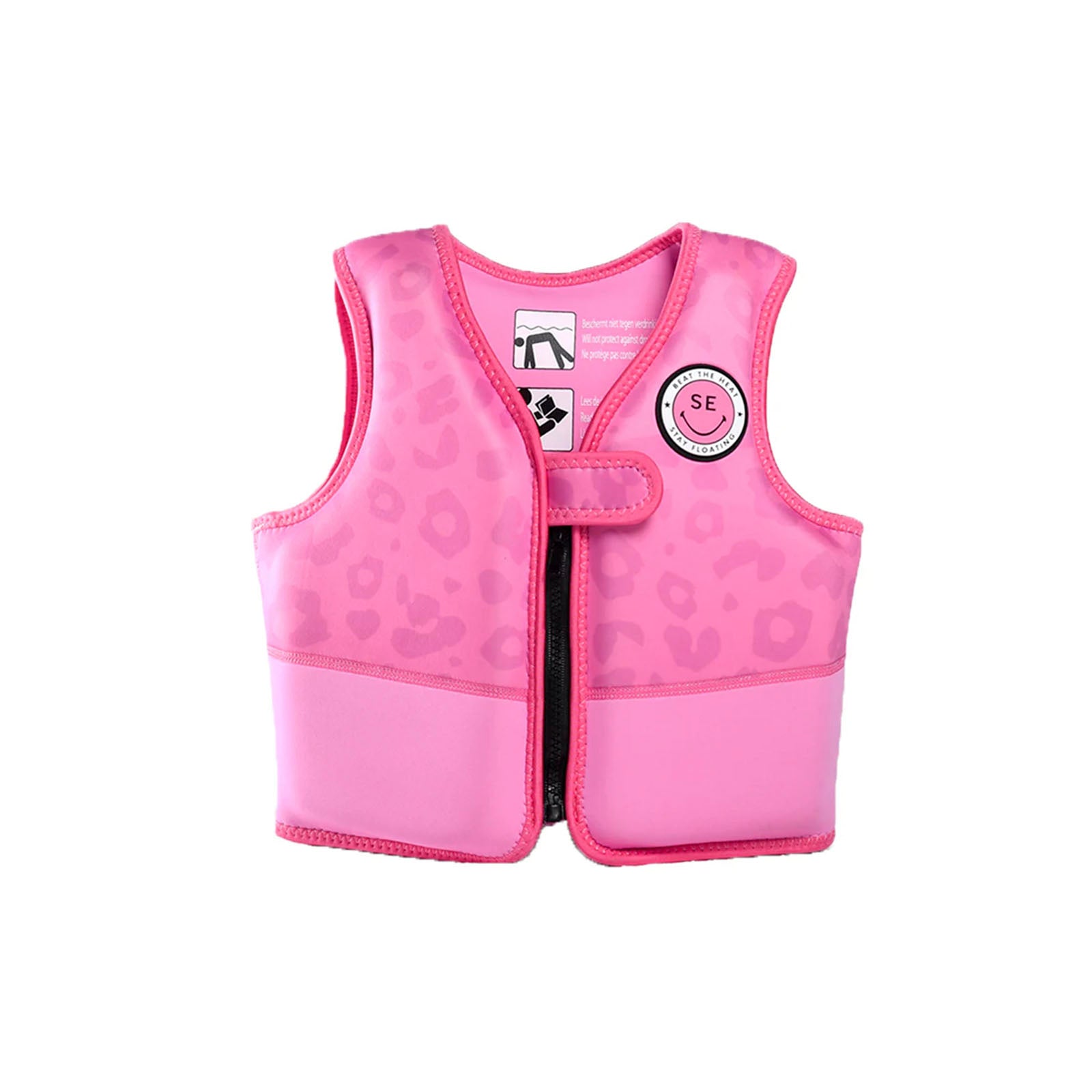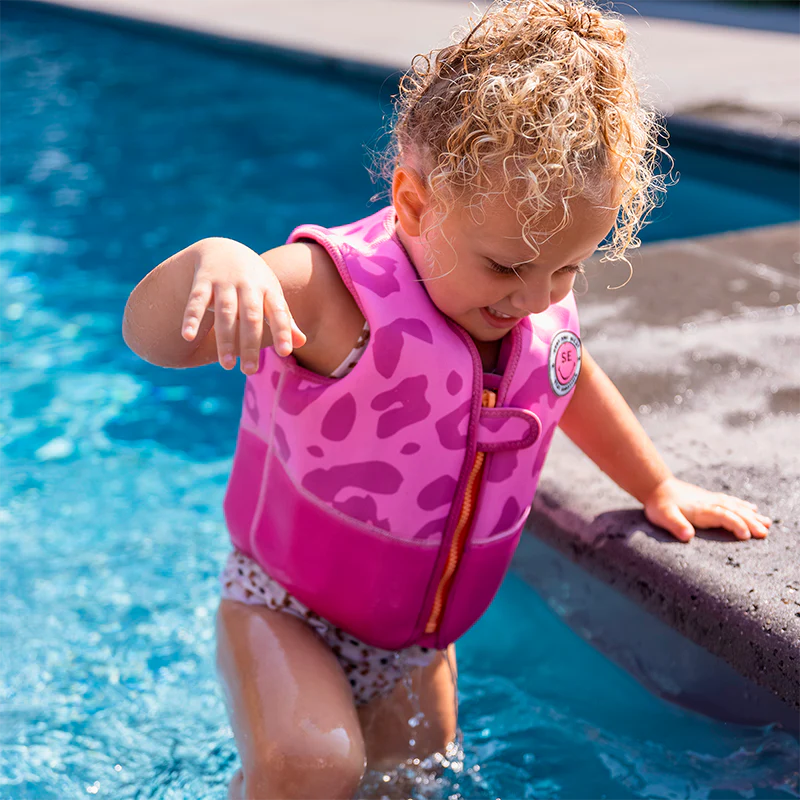 Este chaleco salvavidas de color rosa con estampado de Leopardo le proporciona seguridad y diversión.