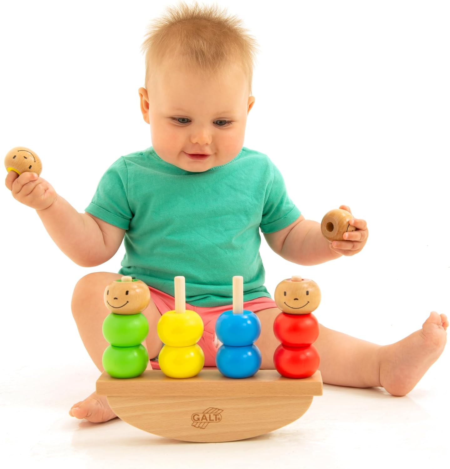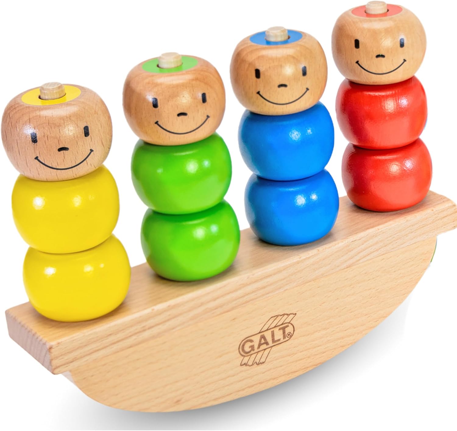 Introduce al bebé a los coloridos personajes de cuentas en este juguete tradicional de equilibrio de madera.