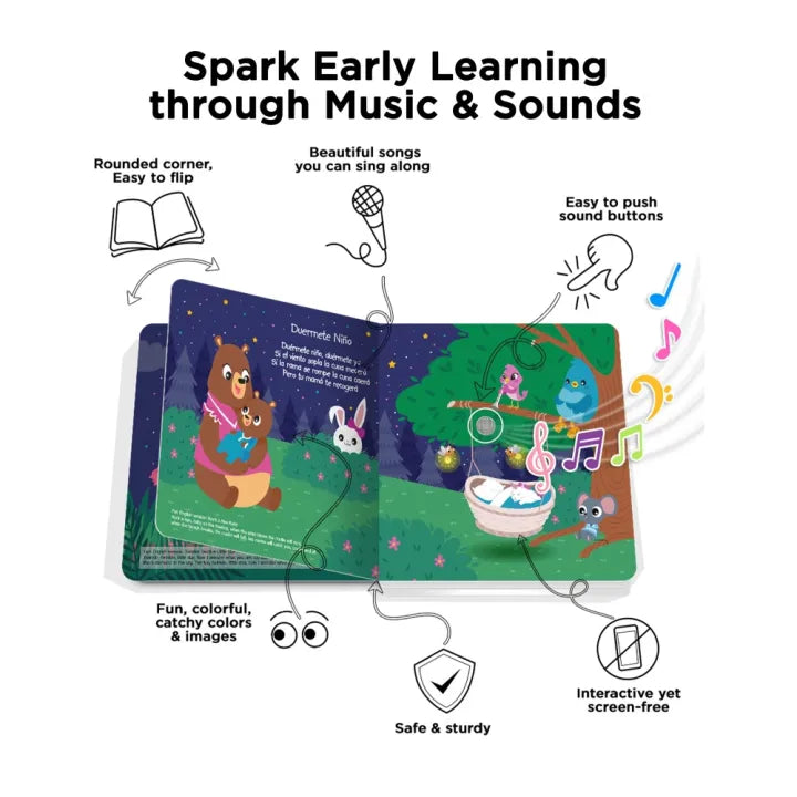 ¡Di buenas noches con el libro sonoro Canciones de Cuna en castellano de Ditty Bird! Con 6 canciones de cuna clásicas como "Estrellita, ¿dónde estás?" y "Arrorró mi Niño", este libro ofrece una manera suave y melódica de calmar a sus pequeños para que duerman mientras les presenta la belleza de las melodías.
