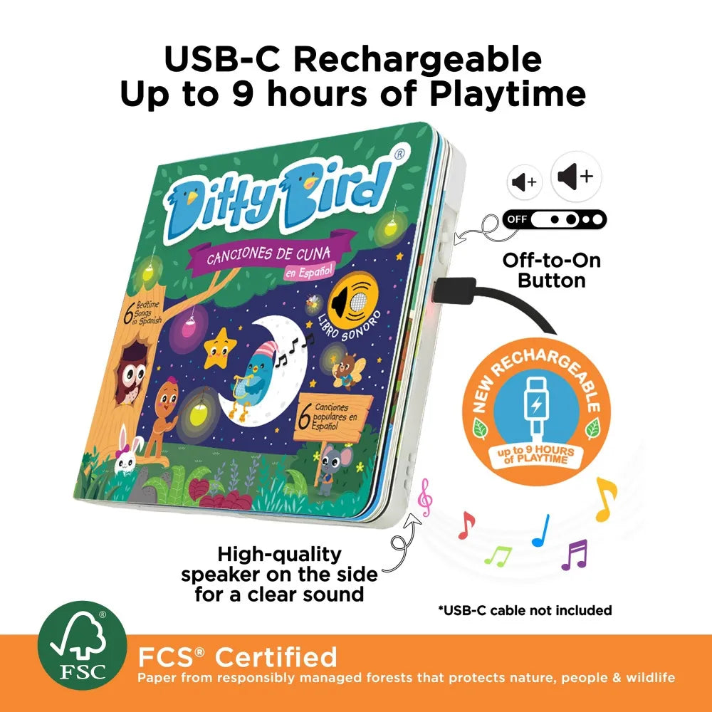 Incluye las canciones: - Estrellita, ¿dónde estás? - Pin Pon - La Lechuza - Arrorro mi niño - A la Nanita Nana - Duérmete niño Los libros Ditty Bird brindan aprendizaje a través de canciones y sonidos.