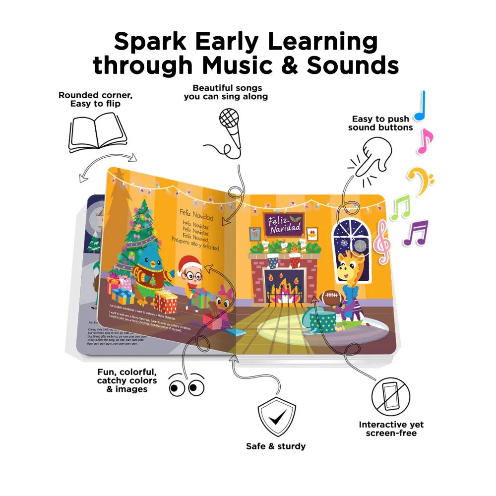 Es un lindo libro para ayudarle a tus chiquitines a aprender 6 villancicos tradicionales y empezar a aprender el español.