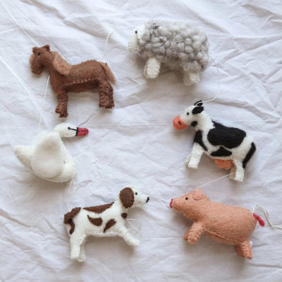La guirnalda tiene un tema divertido y lúdico de animales de la granja y está hecha 100% de lana.