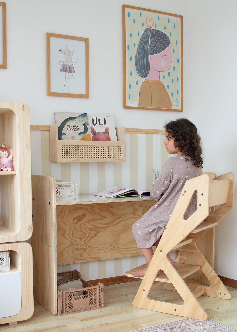 Juguetero Montessori de tres niveles, con excelente capacidad de almacenaje gracias a sus espacios abiertos que permiten una mejor presentación y clasificación de los elementos de juego. Puede convertirse en escritorio infantil o escritorio de adultos con repisa baja por lo que pusimos una cara de repisa con fórmica tipo pizarra para facilitar su limpieza.