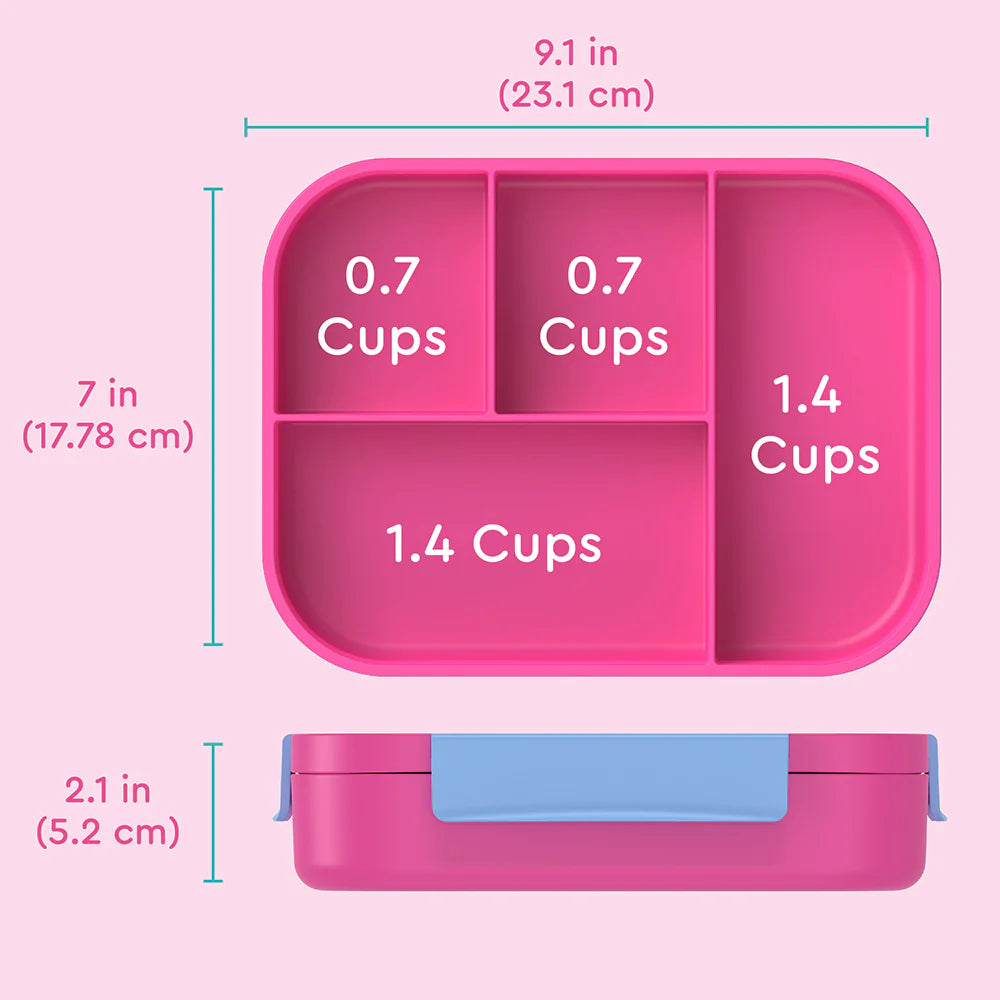 Con la característica bandeja bento de Bentgo, Snap & Go tiene capacidad para un 80 % más de comida que otras loncheras Bentgo Kids y está dividida en porciones para un plato principal o un sándwich completo en los compartimentos grandes, además de fruta, verduras o cereales en los compartimentos pequeños.