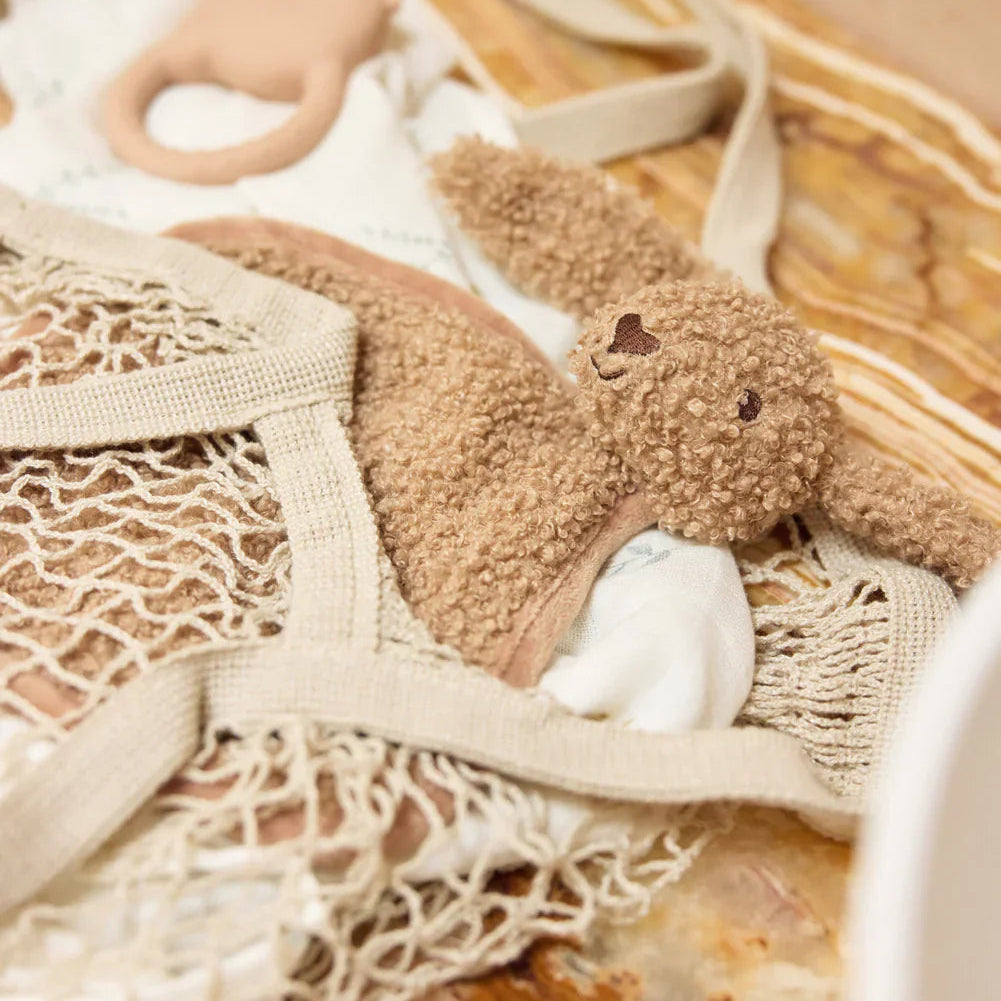 Este encantador porta chupete con forma de conejito en color Biscuit es práctico, suave y lleno de ternura.