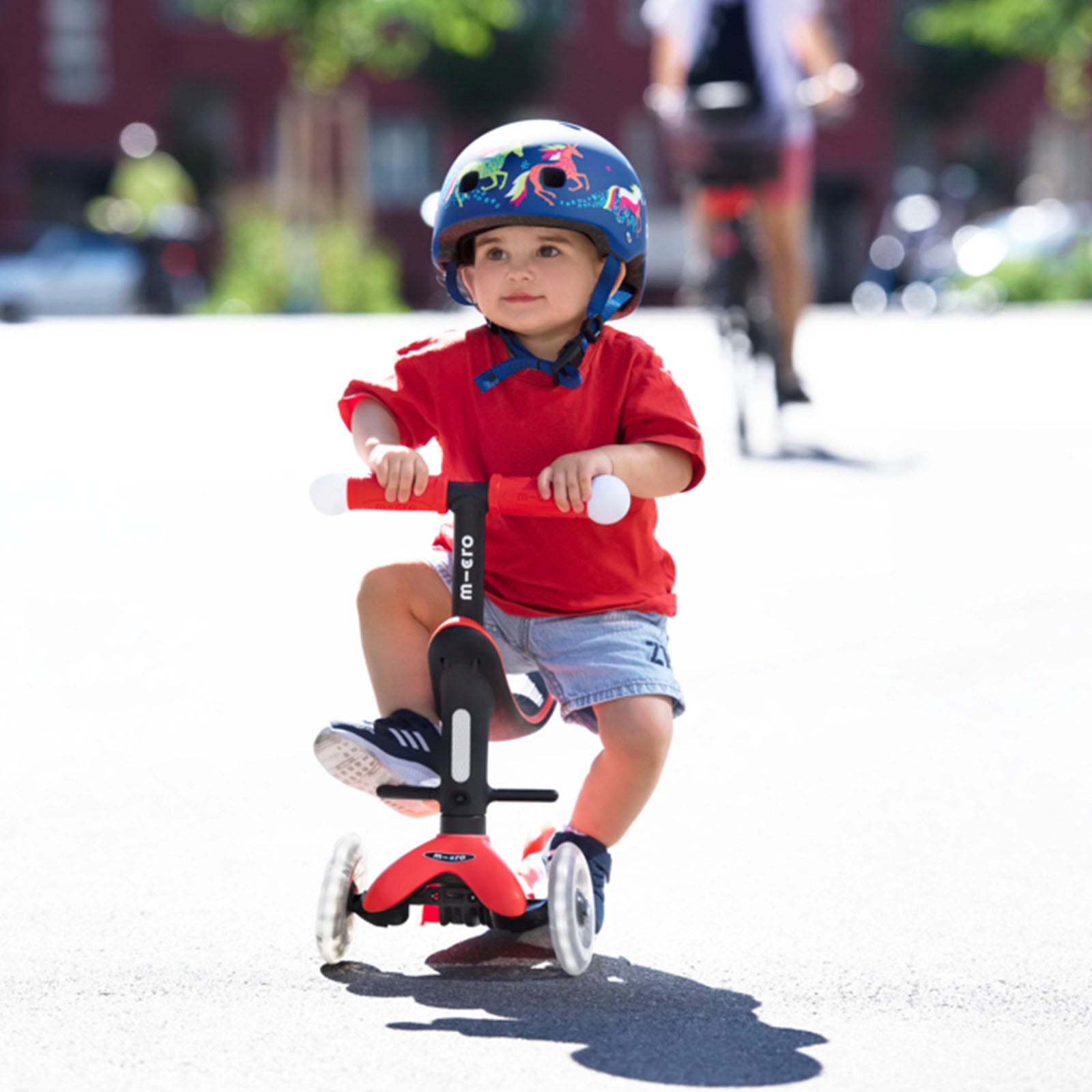 - Segunda etapa: El niño puede usar su scooter sin asiento y en el nivel más bajo del timón (45cm) y este debe ser a la altura de su cintura.