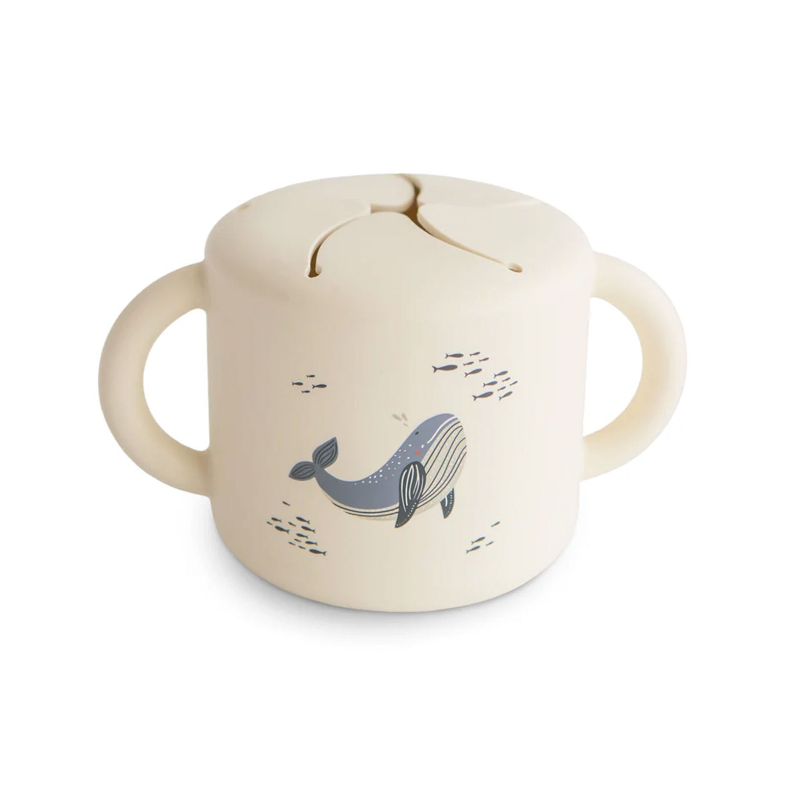 Diseñado con dos pequeñas asas para un fácil agarre para las manos pequeñas, nuestro vaso de silicona para refrigerios es a prueba de derrames para que cualquier bebé lo lleve consigo.