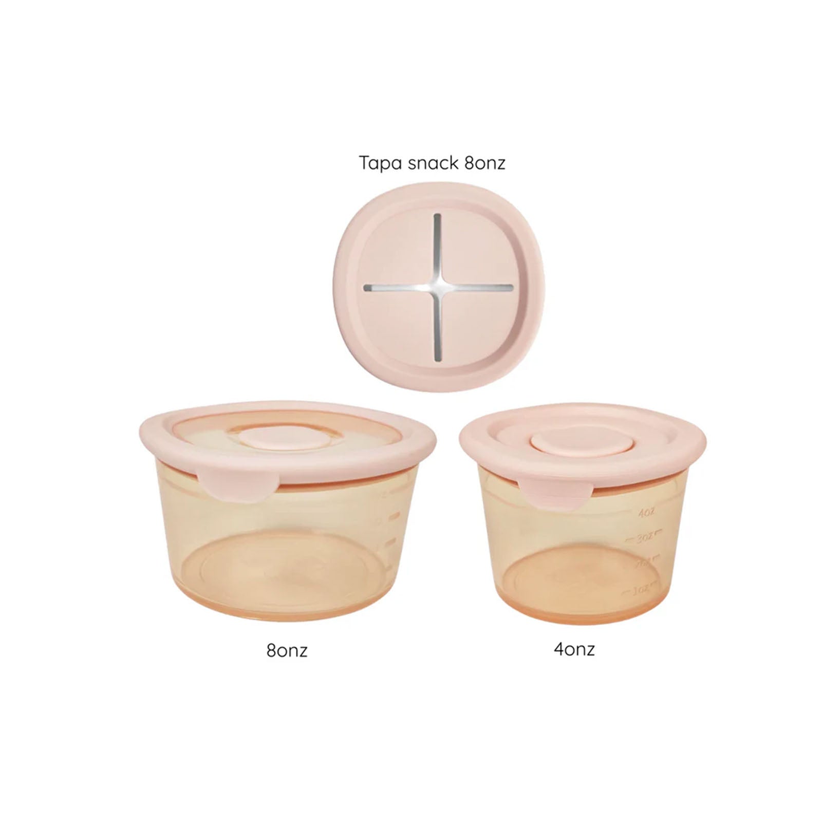 El pack incluye 2 contenedores: 1 de 8onz (230ml) y 1 de 4onz (120ml) + 1 tapa snack anti-caída para el de 8onz.
