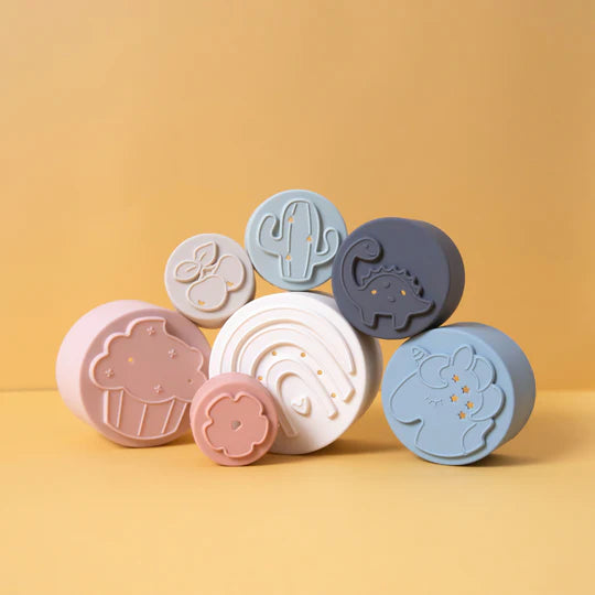 Torre de vasos apilables con números del 1 al 7, distintos colores, figuras y perforaciones, ideales para divertirse en el agua o en la playa ¡Un lindo juguete educativo y didáctico para bebés desde los 6 meses a más!