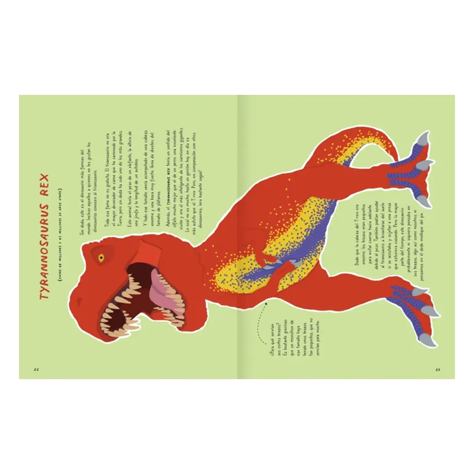 Desde la feroz imagen del Tyrannosaurus rex hasta la curiosa cola espinosa del Stegosaurus, cada página está llena de información emocionante y fácil de entender.