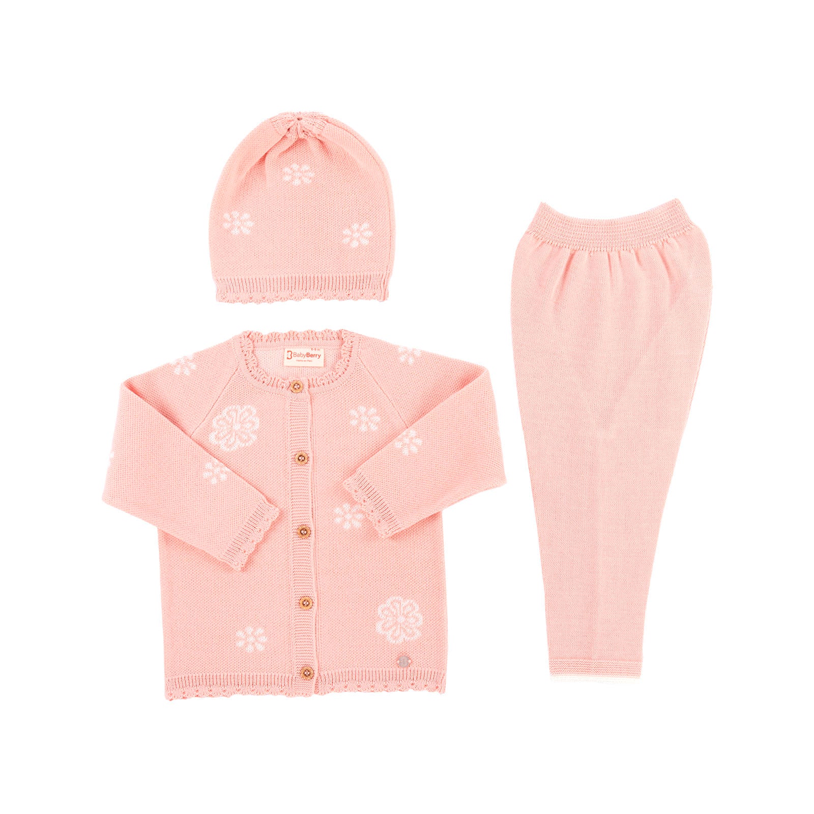 Incluye una chompita abierta con un delicado diseño floral y finos acabados en pretinas y cuello, un pantaloncito con sutil detalle en la basta y un gorrito a juego que completa este conjunto lleno de ternura.